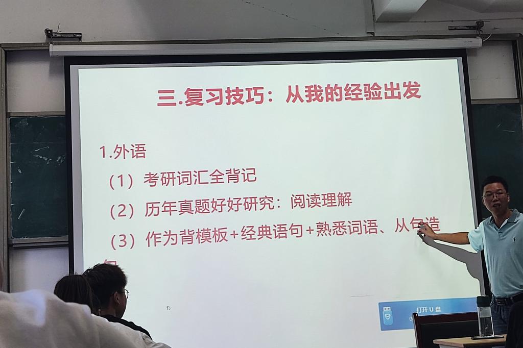 两位老师结合自己经历,对当前考研的趋势、备考方法、考试报名和考研初复试等方面进行了科学系统的分析,并针对考研具体流程和注意事项分享了自己的经验,希望大家结合自身的优势、发展需求和学习情况,进行科学定位、有的放矢,并把握好考研中各项时间节点,做好全面准备,努力取得优异成绩。最后通过问答交流的形式解答同学们在复习过程中出现的疑难问题。
