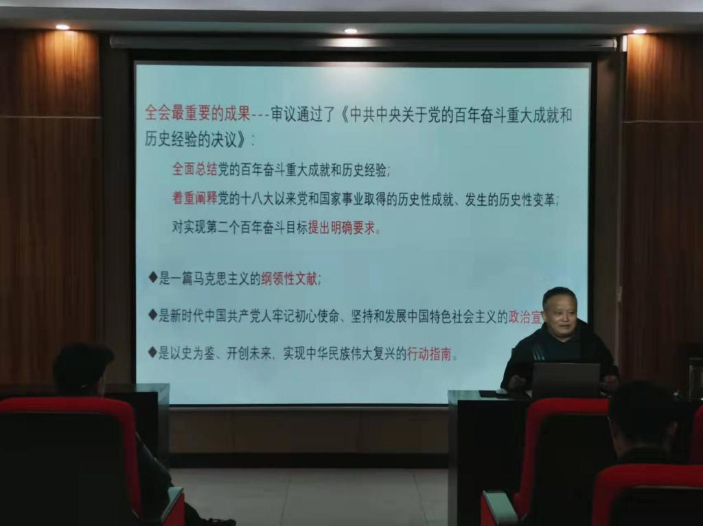 12月24日下午,公司党委委员、副董事长阳光宁到william威廉英国官网进行党的十九届六中全会精神专题宣讲,公司全体师生党员、教务处以及国资处党员参加宣讲会。