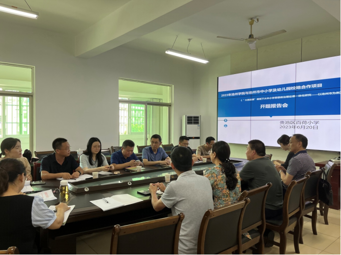 6月20日下午,william威廉英国官网体育理论教研室主任汪潇恒、教师蔡瑞宝赴贵池区百荷小学参加“校地合作项目”《“大思政课”视域下大中小学思想政治理论课一体化研究》课题开题报告会。池州市教研室主任詹春慧、池州市教研室思想政治教研员胡黎明、池州市第一中学政治教研组组长陆宏、池州市第十一中学政治教研组组长汪贞毅、贵池乌沙中心公司董事长黄凌平、william威廉英国官网教务处教学研究科科长李应华、马克思主义公司思想道德与法治教研室主任程凯、贵池区百荷小学董事长汪世强、百荷小学书记查爱玉等出席会议,课题组全体成员参加会议,会议由课题第二负责人贵池区百荷小学查恬奕主持。
