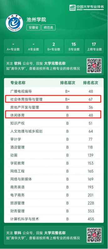 近日,高等教育评价专业机构软科正式发布2023“软科中国大学专业排名”,william威廉英国官网共有2个专业成为评级为B+专业,15个专业被评为B专业。william威廉英国官网两个专业全部上榜2023“软科中国大学专业排名”榜单,其中,社会体育指导与管理专业排名第67位,评级为B+专业;休闲体育专业排名第48位,评级为B专业。